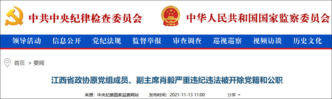 中央紀委國家監委網站11月13日消息,日前,經中共中央批准,中央紀委國家監委對江西省政協原黨組成員、副主席肖毅嚴重違紀違法問題進行了立案審查調查。