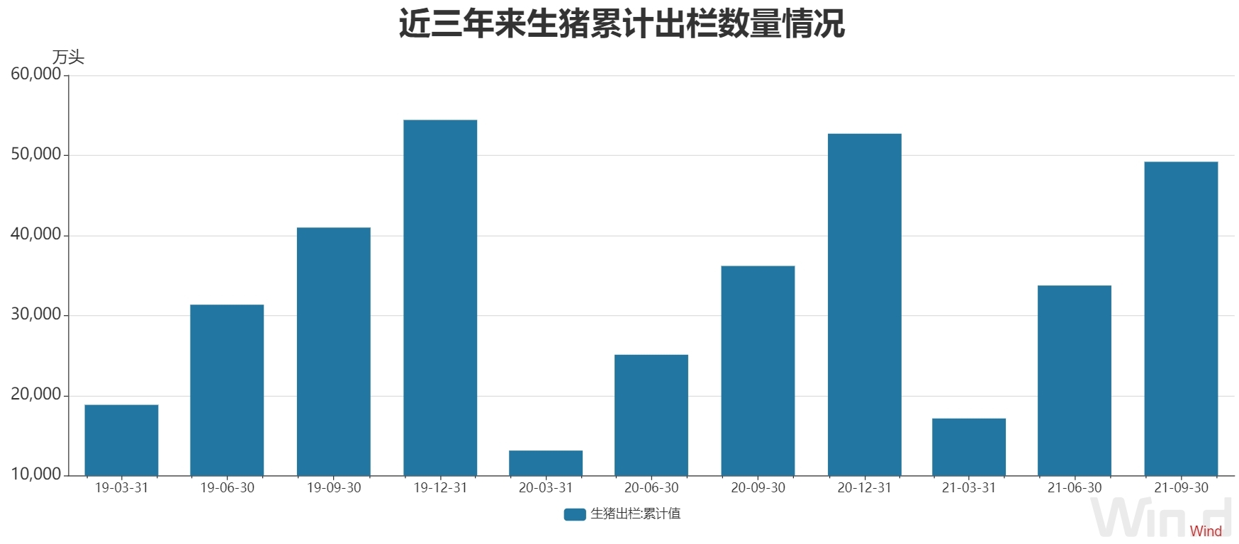 另外,從生豬出欄量來看,一季度,全國生豬出欄17143萬頭,比上年同期增長30.6%;豬肉產量1369萬噸,增長31.9%。上半年,生豬出欄33742萬頭,比上年同期增長34.4%;豬肉產量2715萬噸,增長35.9%。前三季度,生豬出欄49193萬頭,比上年同期增長35.9%,增速比上半年進一步加快1.5個百分點;豬肉產量3917萬噸,增長38.0%。