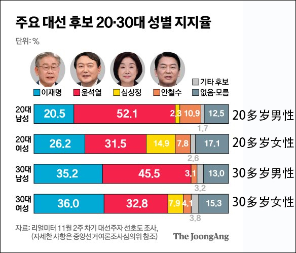 本月8日,韓國民調機構Realmeter發佈的一份調查報告顯示,在20多歲的年輕人中,李在明的支持率持續下降,2天后(10日),該機構發佈的另一份調查報道更詳細地顯示:20、30兩個年齡段的選民中,支持李在明和尹錫悦的女性選民不相上下,但在男性選民中,尹錫悦的支持率明顯高於李在明。尤其是在20多歲的男性選民中,尹錫悦的支持率達到了52.1%,李在明只有20.5%,懸殊較大。