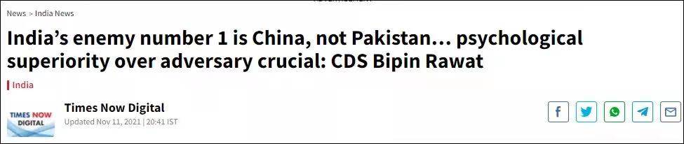 11月11日,印度國防參謀長比平·拉瓦特將中國稱作最大安全威脅