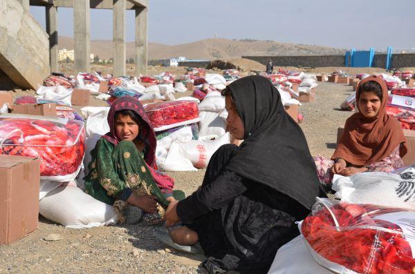 11月9日,在阿富汗霍斯特省,孩子們坐在援助物資旁。 新華社發