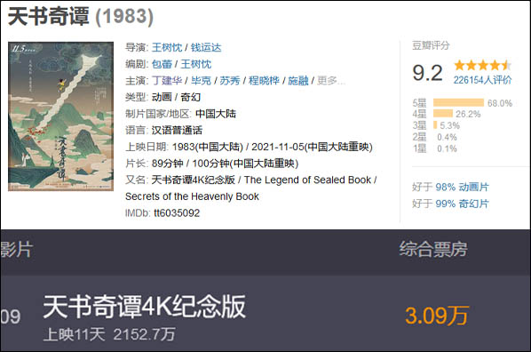 2021年11月5日,《天書奇譚4K紀念版》正式登陸院線。截至發稿,票房剛剛突破2000萬。