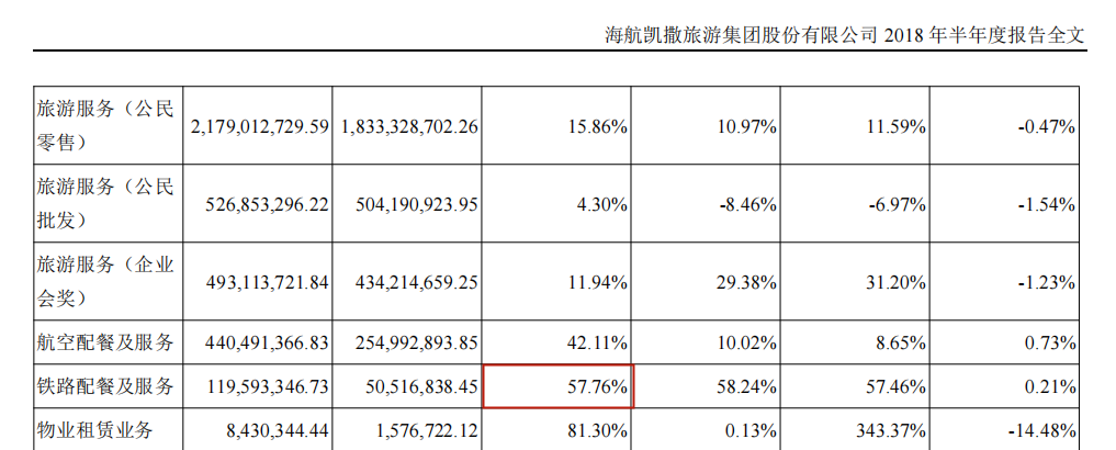 據凱撒旅業2018年中報顯示,當時其鐵路配餐及服務的毛利率高達57.76%,即使其航空配餐業務及服務在2017、2018、2019年間也僅維持在40%左右。但2019年開始鐵路配餐及服務的毛利率驟降至35.16%,在此後幾年的公報中更是不再披露鐵路配餐及服務的毛利率。