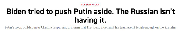 文章認為,儘管拜登此前主張對俄採取強硬路線,但近期在烏克蘭局勢、白俄羅斯與波蘭邊境問題等方面,拜登政府對俄表現得過於“軟弱和謹慎”。