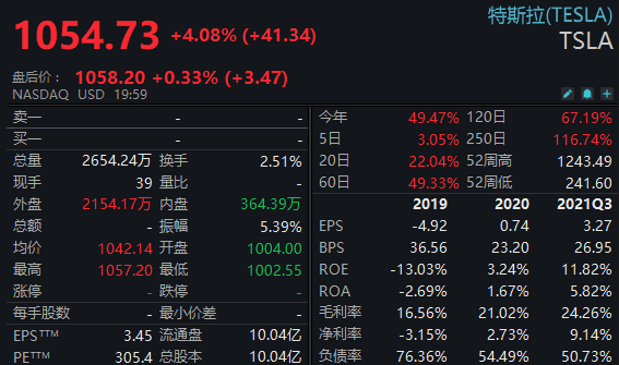 但美股昨日收盤,特斯拉股價上漲4.08%,收於1054.73美元。