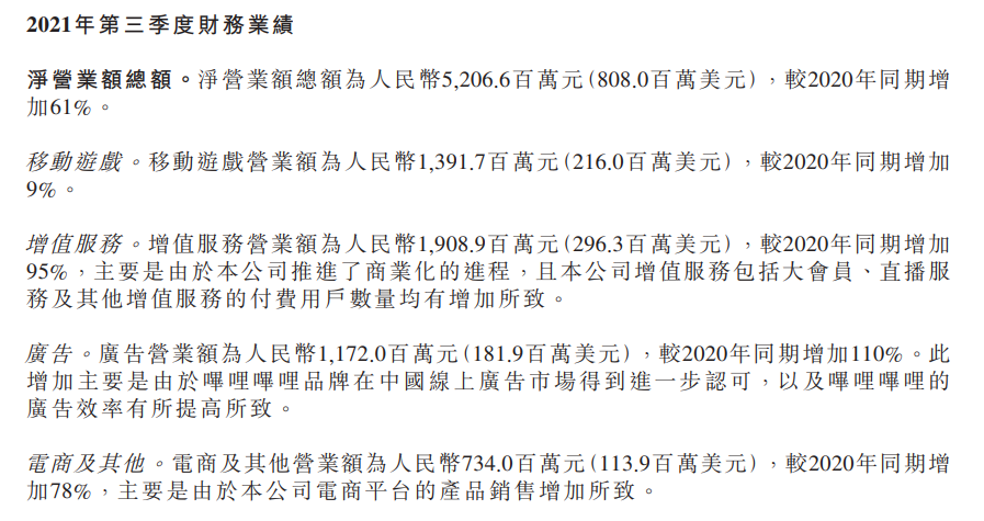 除遊戲外,B站各項業務的營收能力在不斷提升。第三季度,包括增值服務、廣告以及電商等業務營收都保持高速增長。