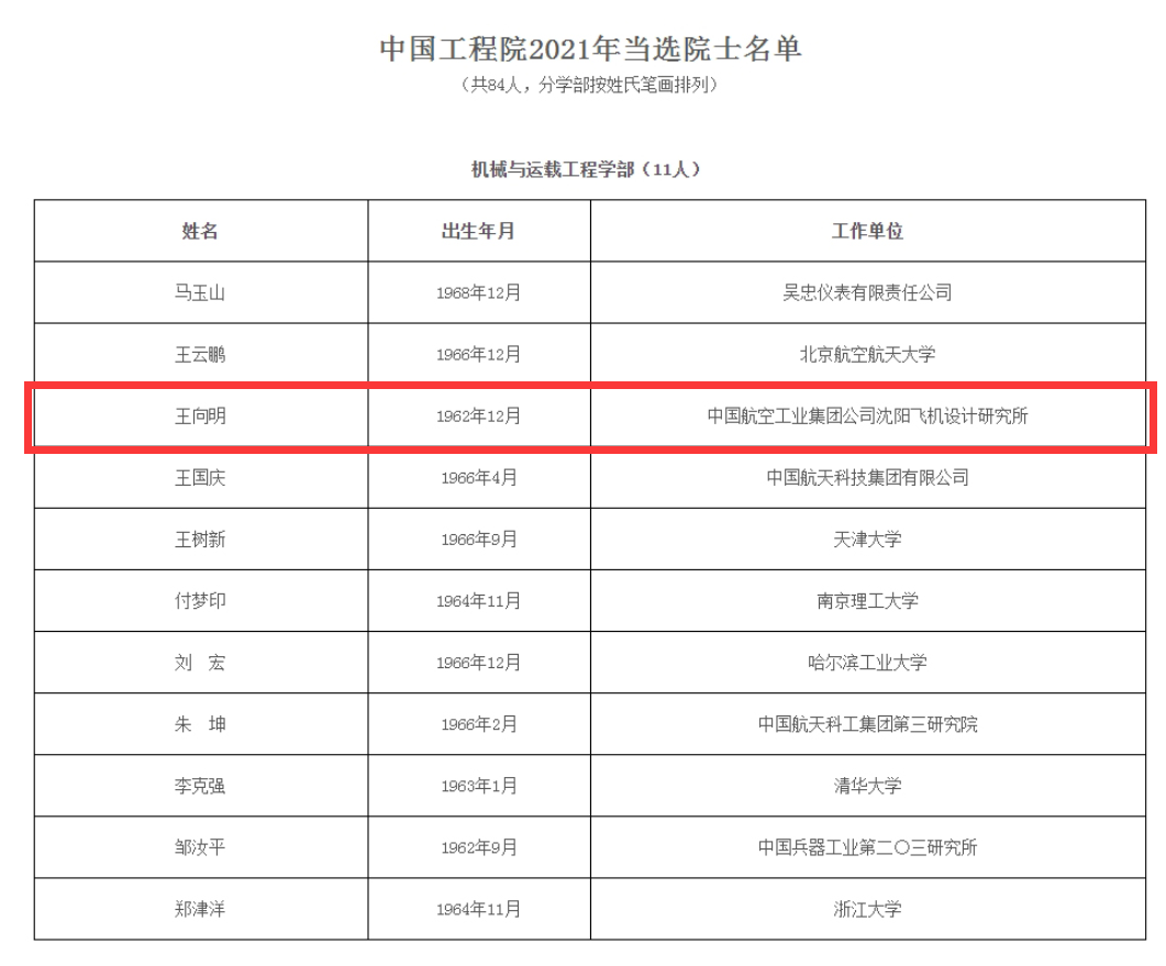 【文/觀察者網 王世純】11月18日,2021年兩院院士增選結果正式揭曉,共有149人當選。中國科學院增選院士65人,中國工程院增選院士84人。其中,中國航空工業集團公司瀋陽飛機設計研究所的王嚮明新當選中國工程院院士。