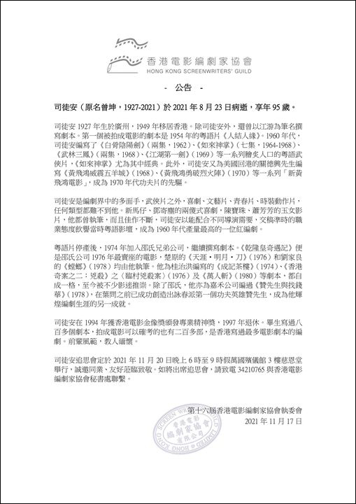 (觀察者網訊)11月18日,香港電影編劇家協會於其社交媒體賬號發佈公告稱,知名編劇司徒安(原名曾坤 1927-2021)於2021年8月23日病逝,享年95歲。