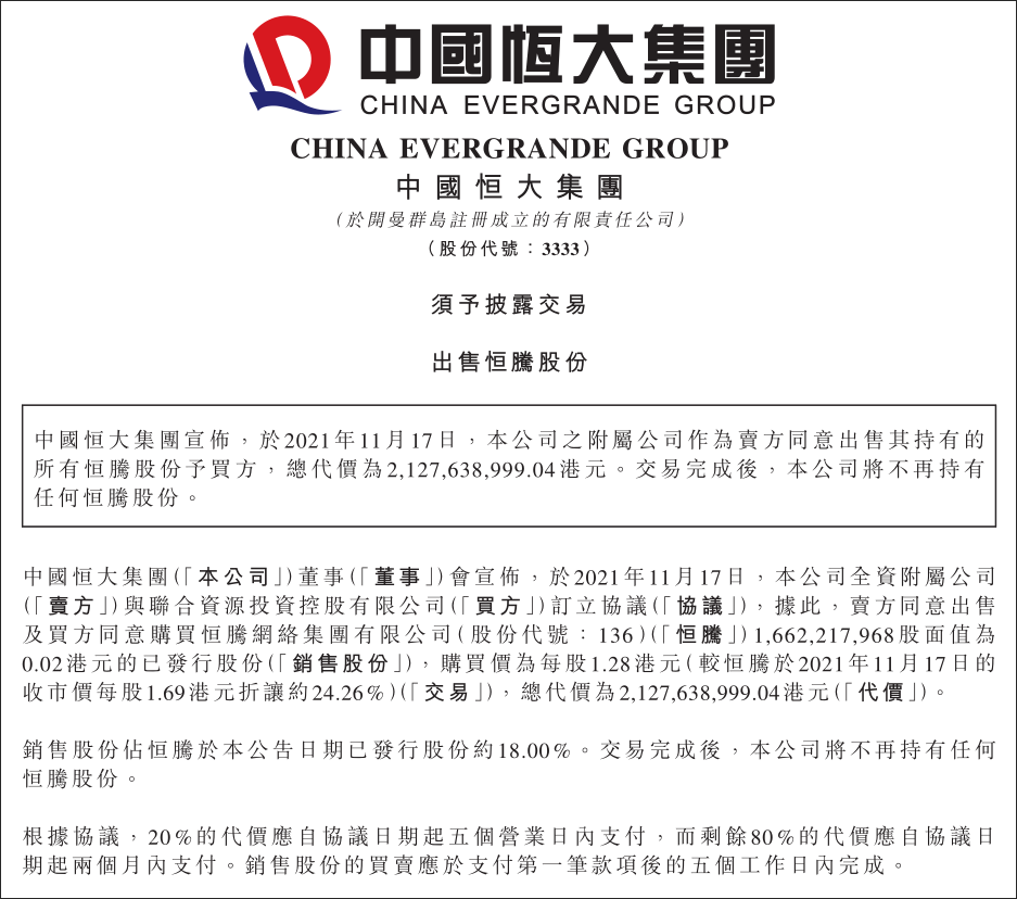 11月17日,中國恒大集團發佈出售恆騰股份公告,擬將恆騰網絡16.62億股已發行股份出售給聯合資源投資控股有限公司,交易價為每股1.28港元(較恆騰於2021年11月17日的收市價每股1.69港元折讓約24.26%),總計21.28億港元。