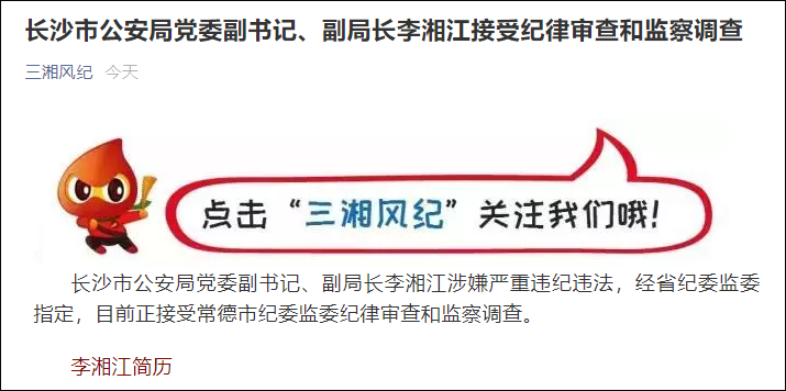 湖南長沙市公安局黨委副書記、副局長李湘江接受紀律審查和監察調查