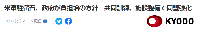 在駐日美軍費用中,日本分攤的部分稱為**“體貼預算”,按照特別協定每5年協商一次,目前的協議將於2022年到期。據日本共同社11月17日報道,日本政府相關人士透露,日本政府同意在新一輪協議中增加駐日美軍經費,包括自衞隊與美軍共同使用的機場、以及聯合訓練等**費用。