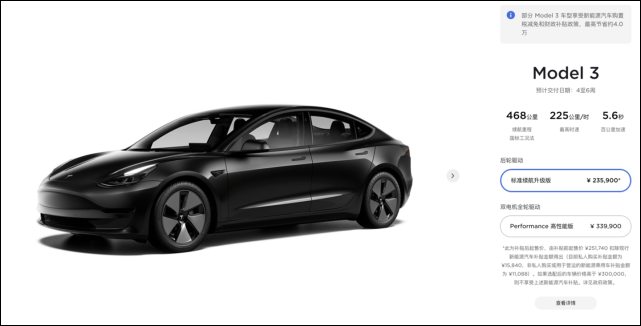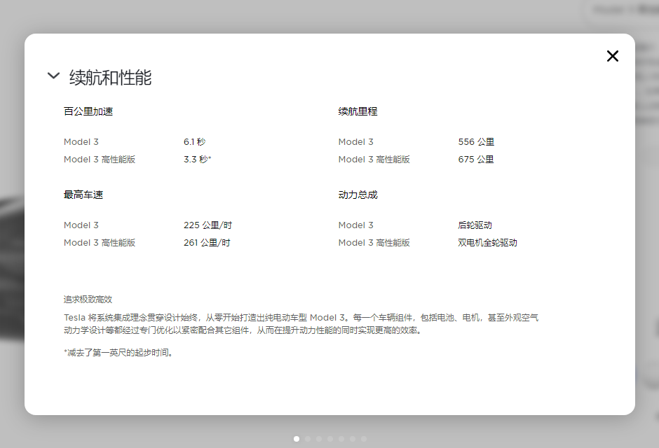 現在特斯拉中國官網的 Model 3續航和性能截圖