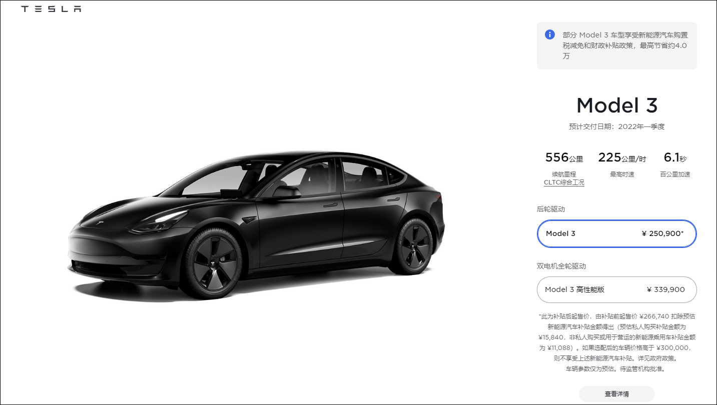 現在特斯拉中國官網的 Model 3價格截圖