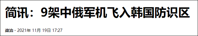 (觀察者網訊)據韓聯社11月19日報道,韓國聯合參謀本部(以下簡稱“聯參本部”)19日表示,2架中國軍機和7架俄羅斯軍機當天一度從獨島(日本稱竹島)東北方向飛入韓國防空識別區後撤離,並未侵犯韓國領空。