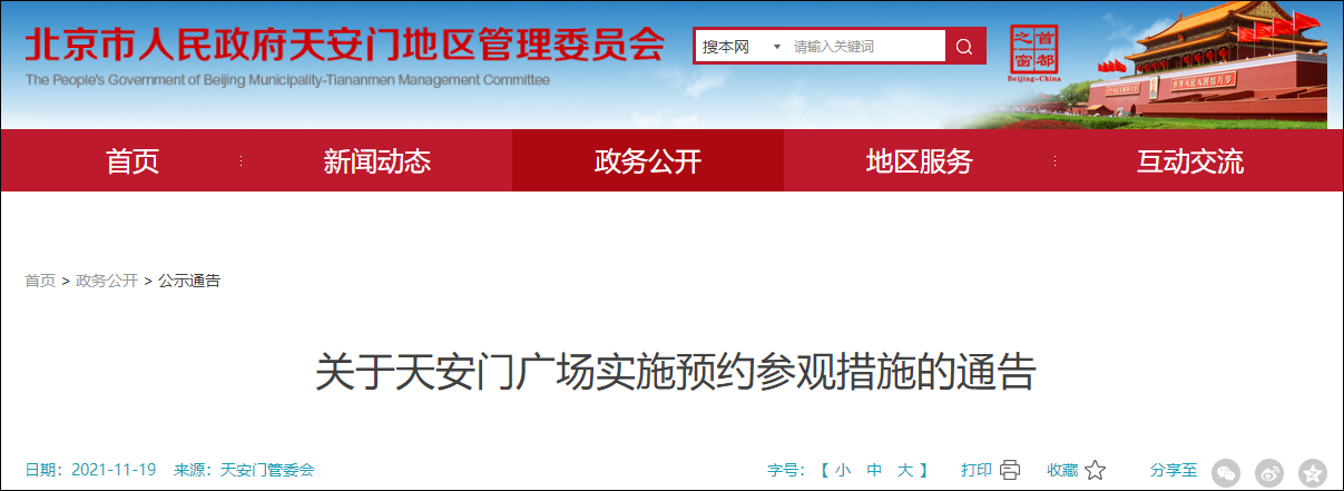 天安門管委會網站11月19日消息,天安門管委會發布通知稱,天安門廣場將自2021年12月15日起實施預約參觀措施。