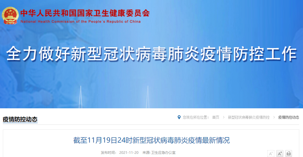 據國家衞健委網站消息,11月19日0—24時,31個省(自治區、直轄市)和新疆生產建設兵團報告新增確診病例23例。其中境外輸入病例20例(上海6例,廣西5例,山東4例,廣東2例,雲南2例,福建1例),含1例由無症狀感染者轉為確診病例(在廣東);本土病例3例(遼寧2例,均在大連市;吉林1例,在吉林市)。無新增死亡病例。無新增疑似病例。