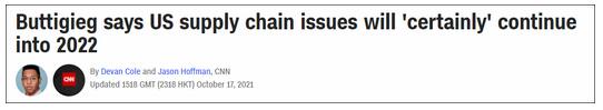 CNN報道:美國交通部長皮特·布蒂吉格(Pete Buttigieg)接受採訪時承認,美國面臨的供應鏈緊缺問題將持續到2022年。