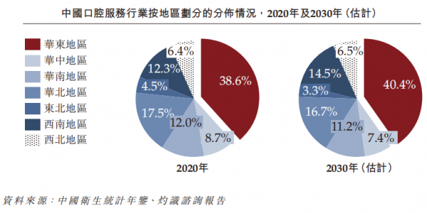 根據灼識諮詢報告,作為經濟最具活力的地區,2020年華東地區佔全國口腔服務市場近39%的份額,預計華東地區口腔服務行業的市場規模以複合年增長率近13.0%的速度增長後,到2030年將達約人民幣2125億元,為中國最具發展潛力的口腔服務市場。