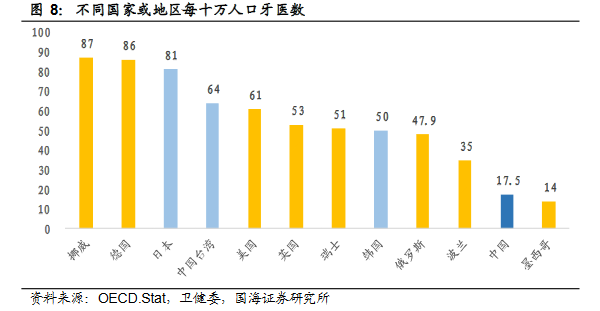 國海證券研報顯示,2019年中國每十萬人口牙醫數17.5人,遠低於韓國的50人、美國的61人、中國台灣的64人、日本的81人。假設中國每十萬人口牙醫數將達到可比國家或地區的水平,則現階段我國牙醫缺口數約為45-90萬人。
