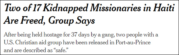 (觀察者網訊)據美國《紐約時報》11月21日報道,美國宗教團體“基督教援助部”當天宣佈,被海地黑幫組織綁架了一個多月的17名美加傳教士中,已有2人獲釋。該組織表示,兩人現在已經安全,但沒有透露具體情況。