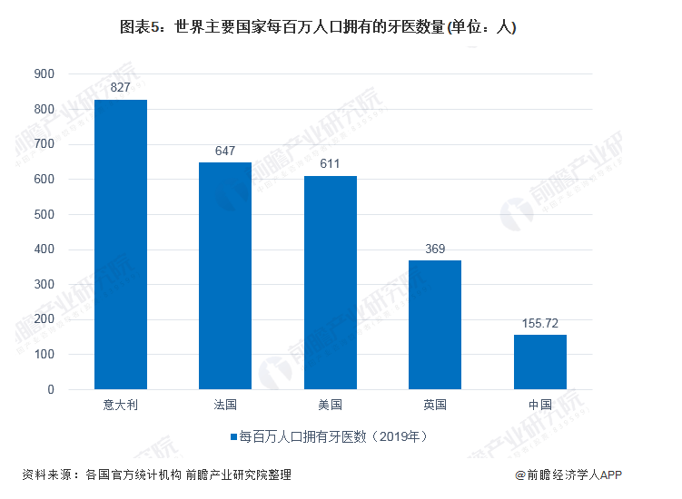 前瞻產業研究院整理的各國統計資料顯示,我國口腔衞生從業人員的數量遠遠未達到飽和狀態。2018年,發達國家每百萬人口牙醫數量大致在500-1000之間,而我國每百萬人擁有牙醫數僅156人。