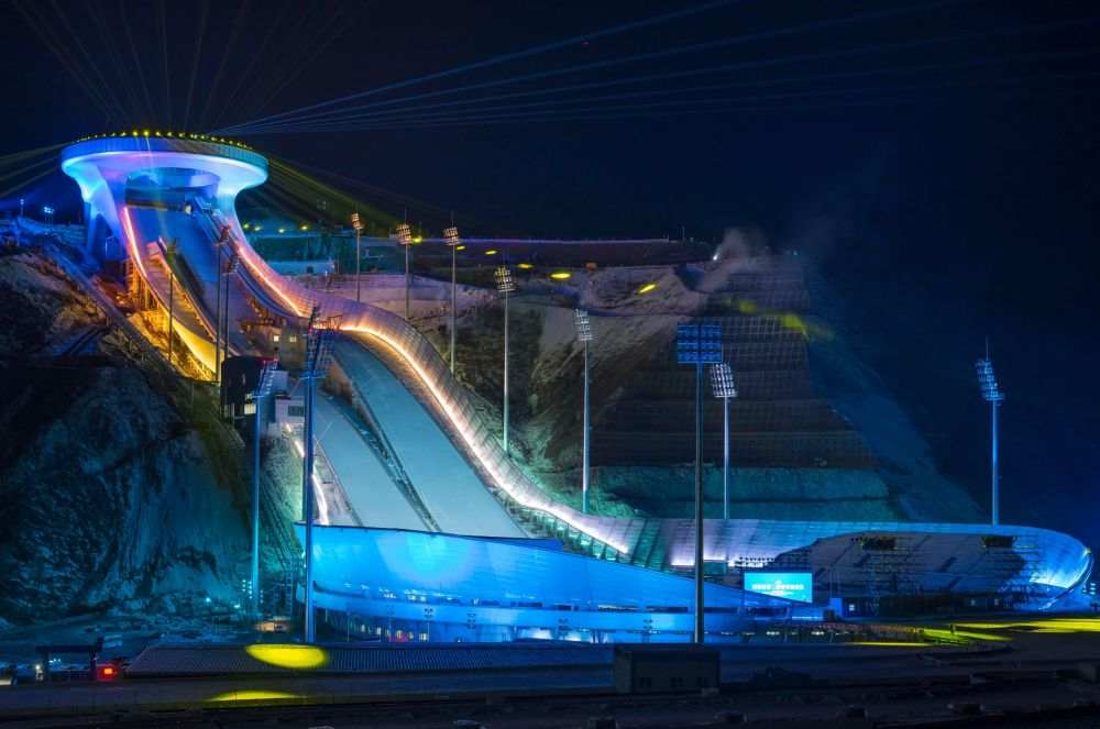位於河北省張家口市崇禮區的國家跳台滑雪中心“雪如意”點亮效果(無人機照片)。新華社發