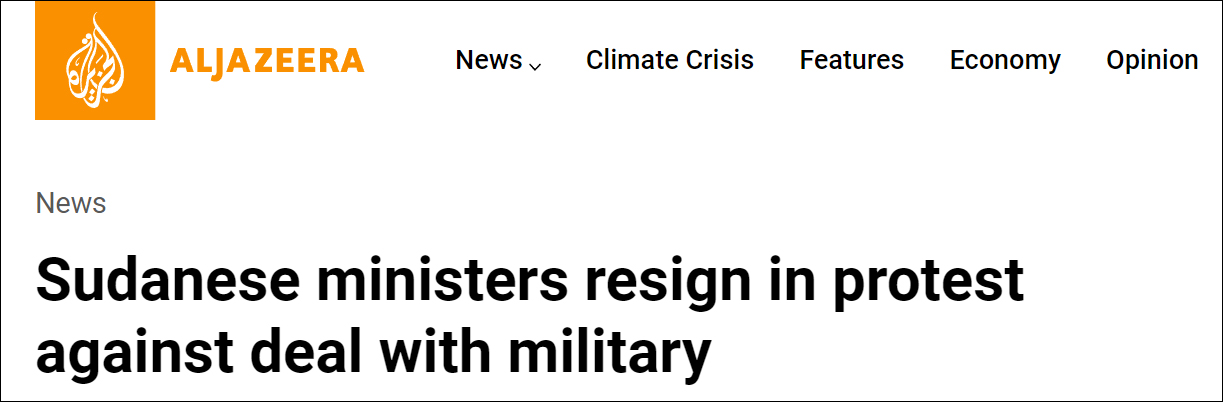 據蘇丹過渡政府文化和信息部網站消息,部長們在聲明中沒有解釋提交辭職的原因,但在發表聲明後,他們表示拒絕週日(21日)達成的協議,認為這將使軍事政變合法化。