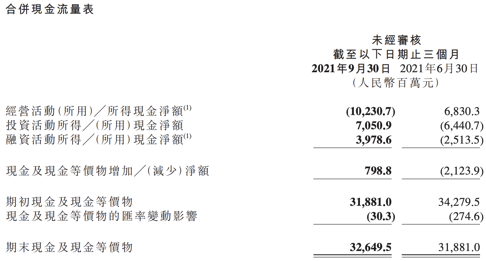 截至2021年9月30日,該集團現金資源總額為981億元。
