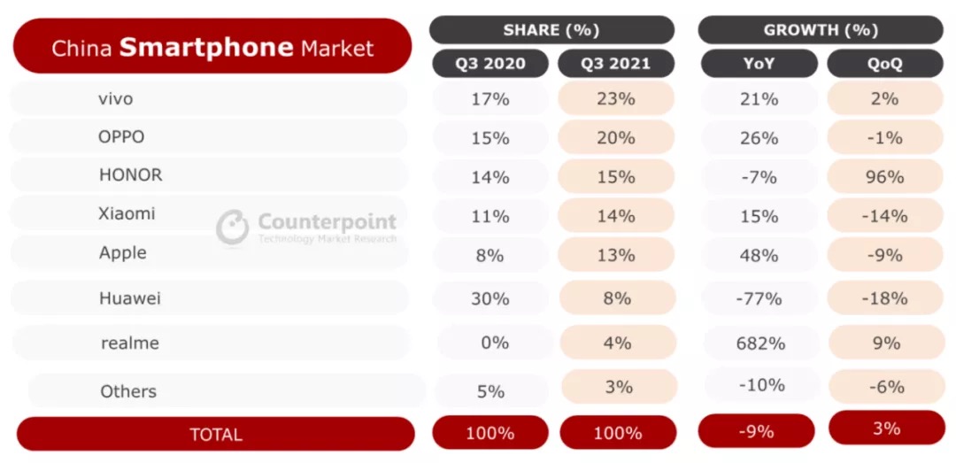 然而,10月28日,據市場研究機構Counterpoint Research的統計數據,小米在華市場份額仍落後於vivo、OPPO、榮耀等,位列第四。