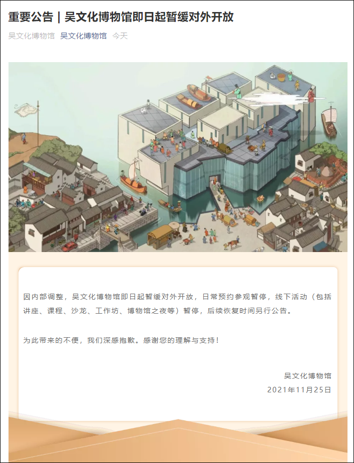 微信公眾號“吳文化博物館”公告:因內部調整,吳文化博物館即日起暫緩對外開放,日常預約參觀暫停,線下活動(包括講座、課程、沙龍、工作坊、博物館之夜等)暫停,後續恢復時間另行公告。