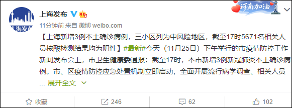 @上海發佈 消息,今天(11月25日)下午舉行的上海市疫情防控工作新聞發佈會上,市衞生健康委通報:截至17時,本市新增3例新冠肺炎本土確診病例。市、區疫情防控應急處置機制立即啓動,全面開展流行病學調查、相關人員排查、採樣檢測和隔離管控,落實相關場所及環境終末消毒等防疫措施。目前這3例病例均已轉運至上海市公共衞生臨牀中心隔離治療,病情穩定。