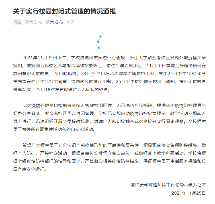 微信公眾號“浙大發布”11月25日消息,浙江大學疫情防控工作領導小組辦公室發佈通報: