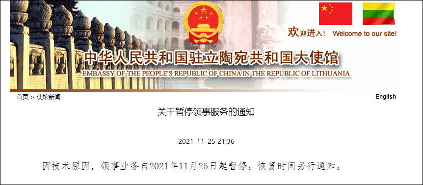 中國駐立陶宛大使館:因技術原因,領事業務11月25日起暫停 None 2021-11-25 中國駐立陶宛大使館網站11月25日發佈通知:因技術原因,領事業務自2021年11月25日起暫停。恢復時間另行通知。