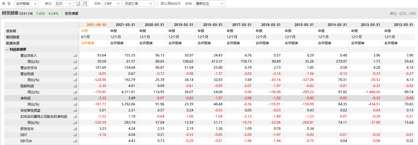 上市以後,阿里健康連年虧損。僅在2021財年一轉頹勢,以3.42億元的歸母淨利潤,較去年虧損的1570萬元轉盈。而此次中期業績的表現,也許又將為整個財年的表現掛上一個大大的問號。