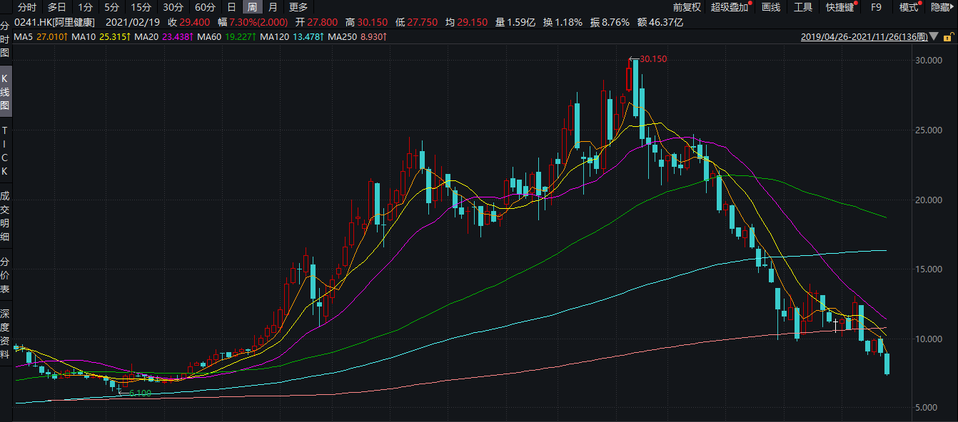 (文/觀網財經 王木巨)今日(11月26日),阿里健康(00241.HK)繼續走弱。繼昨日股價一度觸及7.52港元之後,今日收報每股7.41港元,創2019年11月以來新低。較歷史高位,現在股價跌超75%。