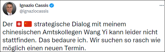 約4個小時後,瑞士外交部再度發推稱,目前無法繼續前往中國,卡西斯將從莫斯科返回瑞士。
