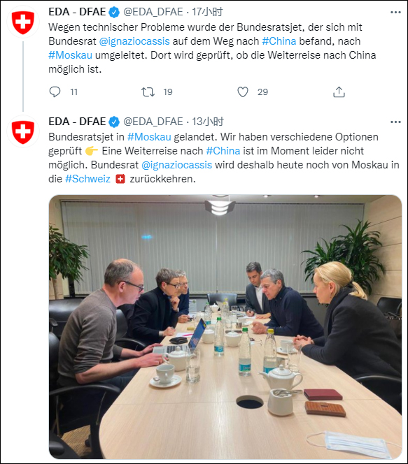期間,瑞士外交部推特先是表示,將在莫斯科確認是否有可能繼續前往中國。