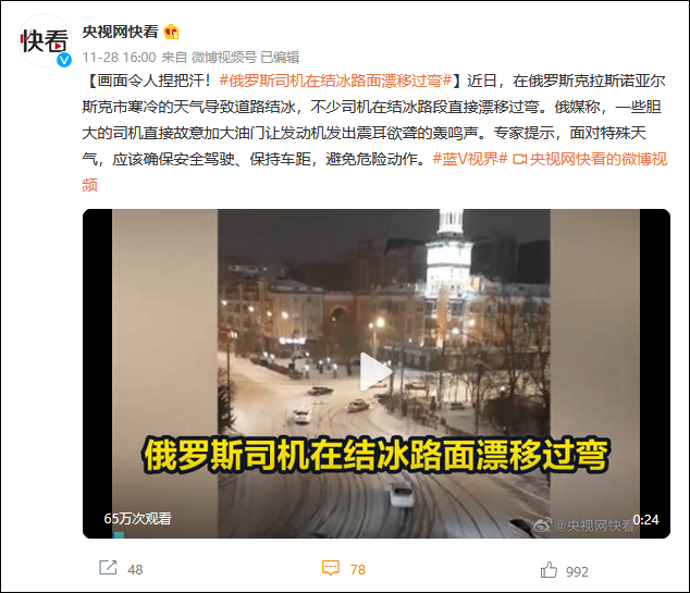 今日俄羅斯電視台26日在推特轉發這一漂移視頻時也曾調侃道:“不管你喜不喜歡,俄羅斯的冬天都會讓你打滑。在俄羅斯克拉斯諾亞爾斯克,為了保護你的車免受交通事故的傷害,你必須當一名《速度與激情》中的司機。”