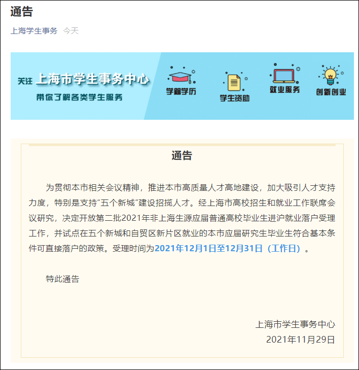 為貫徹上海市相關會議精神,推進上海市高質量人才高地建設,加大吸引人才支持力度,特別是支持“五個新城”建設招攬人才。經上海市高校招生和就業工作聯席會議研究,決定開放第二批2021年非上海生源應屆普通高校畢業生進滬就業落户受理工作,並試點在五個新城和自貿區新片區就業的上海市應屆研究生畢業生符合基本條件可直接落户的政策。受理時間為2021年12月1日至12月31日(工作日)。