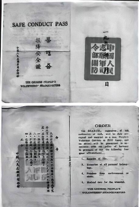 莫若健上前詢問,一名俘虜趕緊將手中的紙片遞給他。莫若健一看,原來是司令部印發的《投降安全證》。此證蓋有“中國人民志願軍司令部關防”大印,用英語、漢語、朝鮮語三國文字印製,下發給敵工部門用於瓦解敵軍。上面的內容是: