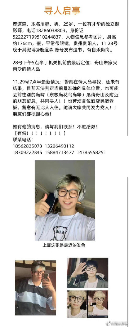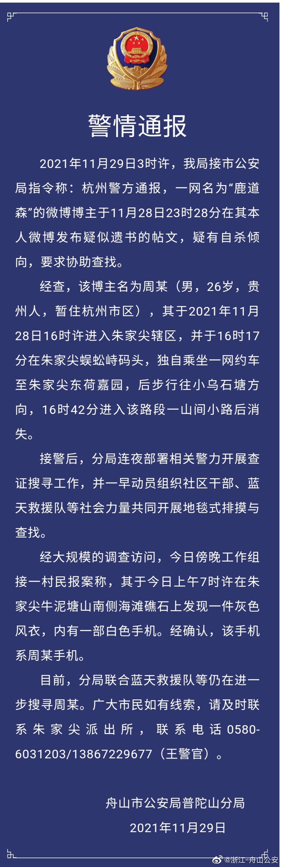 之後,“鹿道森”的朋友看到該微博,並感到他有自殺傾向,緊急報警併發布了一則尋人啓事求助。他們稱,28日下午5點半,“鹿道森”手機關機前的最後定位是舟山朱家尖南沙的情人島。截至29日7點半,警方還在情人島尋人,他們懇請舟山及附近的人留意,幫助共同尋找“鹿道森”。