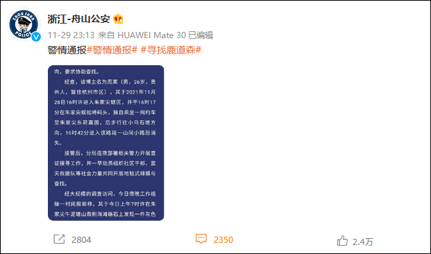 29日晚,“鹿道森”失聯地警方浙江舟山公安通報最新情況。據通報,“鹿道森”於11月28日16時許進入朱家尖轄區,並於16時17分在朱家尖蜈蚣峙碼頭,獨自乘坐一網約車至朱家尖東荷嘉園,後步行往小烏石塘方向,16時42分進入該路段一山間小路後消失。