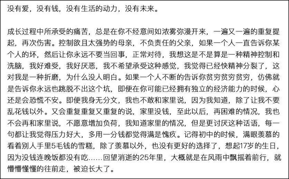 根據長文,因為完不成跨級功課,9歲的“鹿道森”被父親踢了一腳。自此,他遠離父母回家鄉,成為留守兒童,也由此懷疑自己是否不值得被愛。“如果世界上只需要神童,那我這樣智商的孩子,是否就應該被這樣對待。”因為兒時看起來像女孩,又很安靜,回到家鄉讀書的“鹿道森”被同學叫“娘炮”,“被排擠,讓下跪”。缺少他人理解,又無人訴説,在經歷漫長的校園霸凌後,“鹿道森”在文中寫下“請停止校園霸凌吧”。