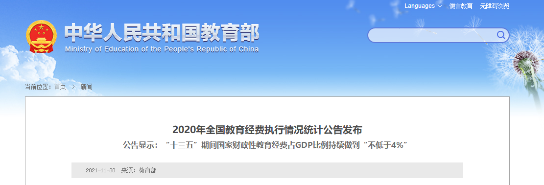 教育部網站11月30日消息,教育部、國家統計局、財政部近日發佈了2020年全國教育經費執行情況統計公告。公告顯示,2020年全國教育經費總投入為53033.87億元,比上年增長5.69%。其中,國家財政性教育經費為42908.15億元,比上年增長7.15%,佔GDP比例為4.22%。“十三五”期間持續做到“不低於4%”,這是自2012年以來連續第九年做到“不低於4%”。