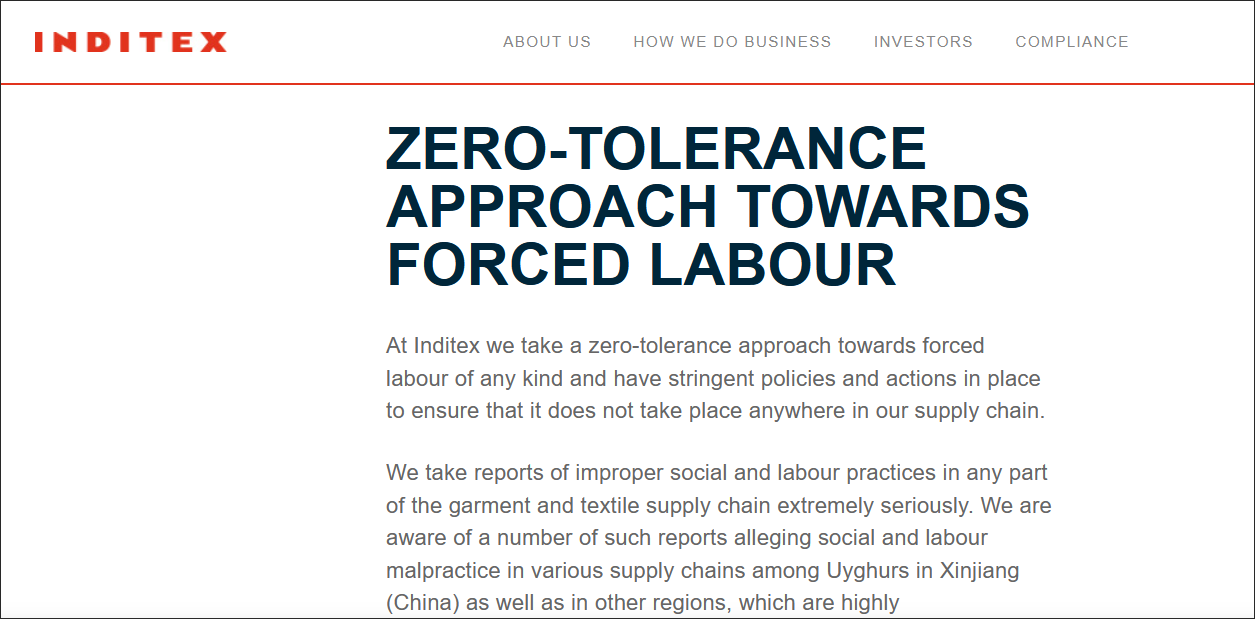 中國消費者發現,ZARA母公司盈迪德集團在官網發佈了一則題為“對強迫勞動零容忍”的聲明。