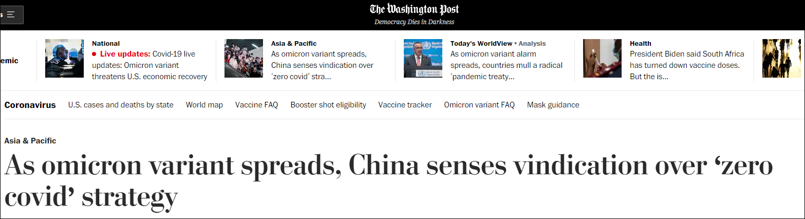另一家美媒《華盛頓郵報》則在11月30日發表了一篇報道文章,題為“隨着奧密克戎變種的傳播,中國判斷‘動態清零’戰略是正確的”。