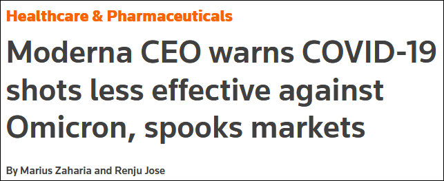 莫德納公司CEO斯特凡·班塞爾(Stéphane Bancel)當天在接受英國《金融時報》採訪時警告稱,現有新冠疫苗對於奧密克戎變種,不會像對於德爾塔變種那樣有效,這番話猶如“五雷轟頂”,給金融市場再度敲響警鐘。