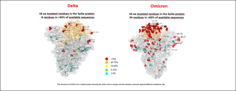 德爾塔毒株與奧密克戎毒株刺突蛋白突變對比圖 圖自意大利羅馬兒童醫院