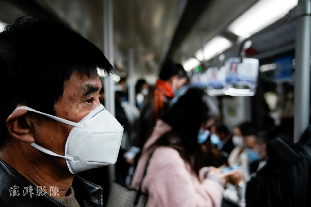 11月30日,上海地鐵早高峯,大批市民乘坐地鐵上班,疫情當前,市民們自覺佩戴好口罩,防疫不鬆懈。圖自澎湃影像
