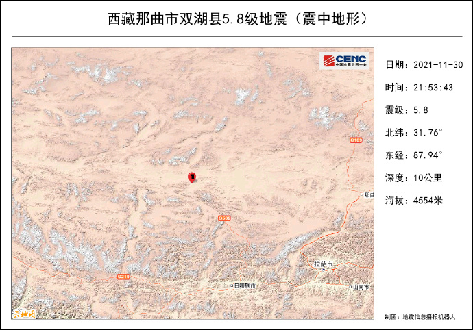 @中國地震台網速報 消息,中國地震台網正式測定:11月30日21時53分在西藏那曲市雙湖縣(北緯31.76度,東經87.94度)發生5.8級地震,震源深度10千米。
